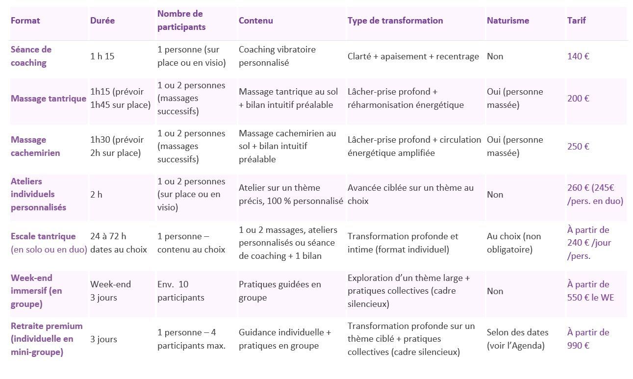 immersion individuelle, courte et intense (24, 48 ou 72 h), mêlant massage, atelier et/ou coaching vibratoire.