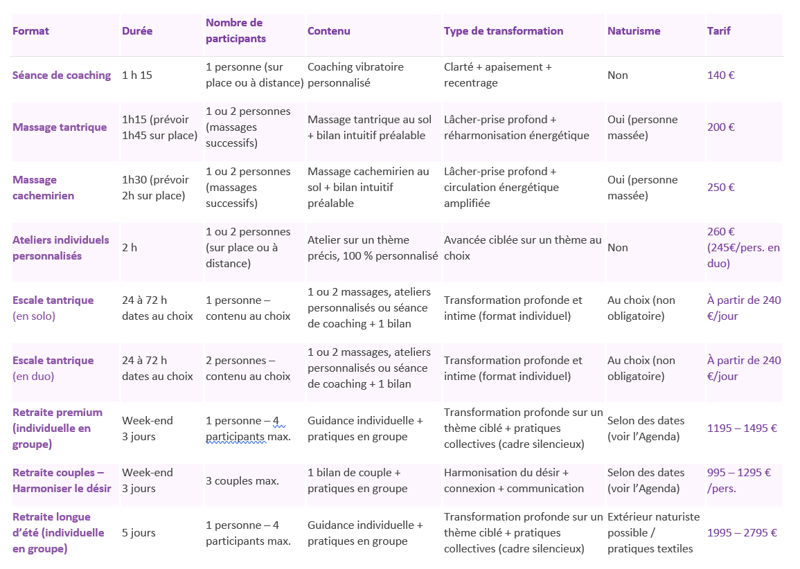Réservées à 4 participants maximum, ces immersions individuelles et intensives (3 ou 5 jours) permettent d’avancer en profondeur sur des thèmes essentiels : relation à soi, désir, énergie, bien-être intime, santé & alimentation…